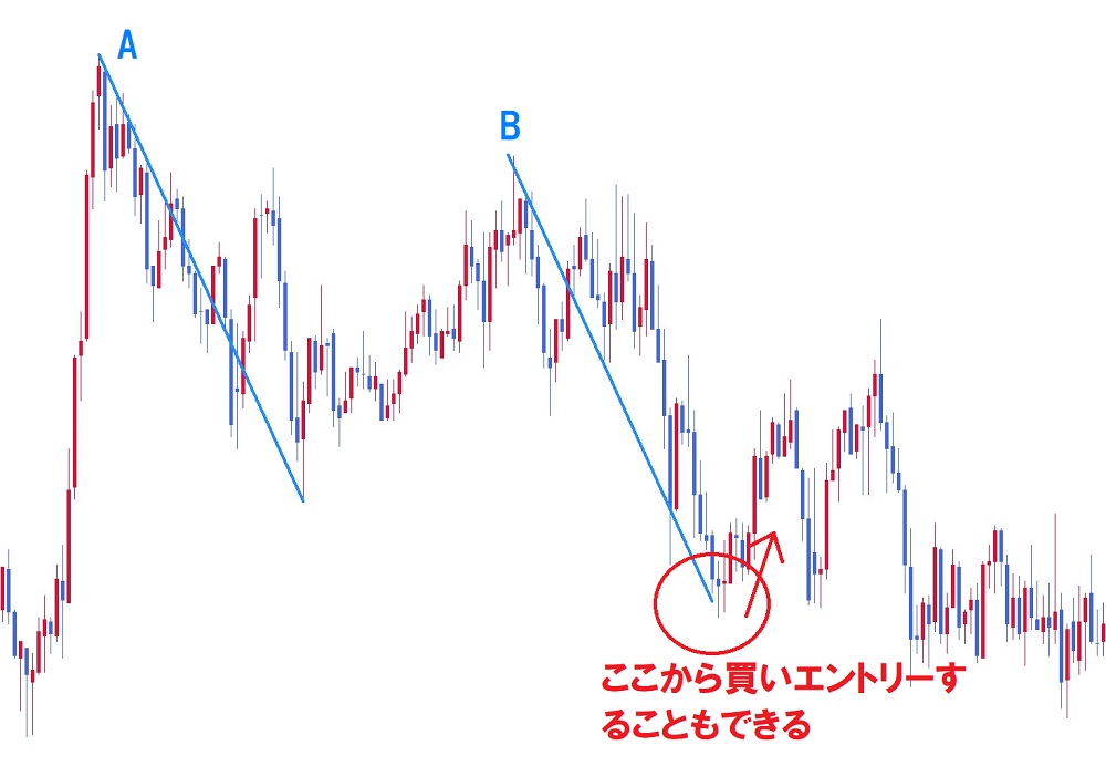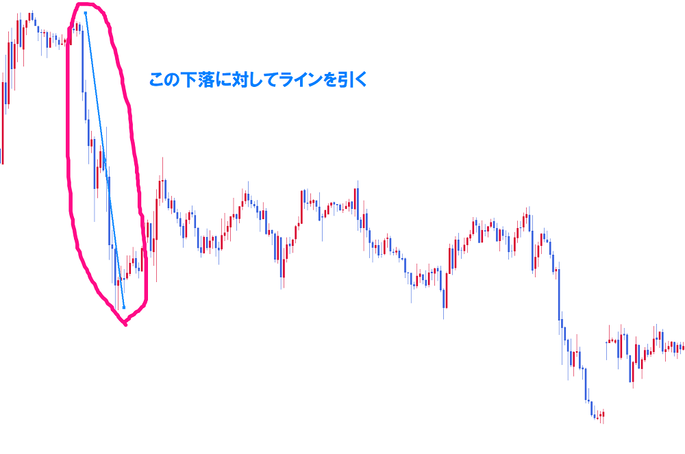 まず、最初の山の頂点から1本の下落へ向かって斜めのラインを引いてみましょう。