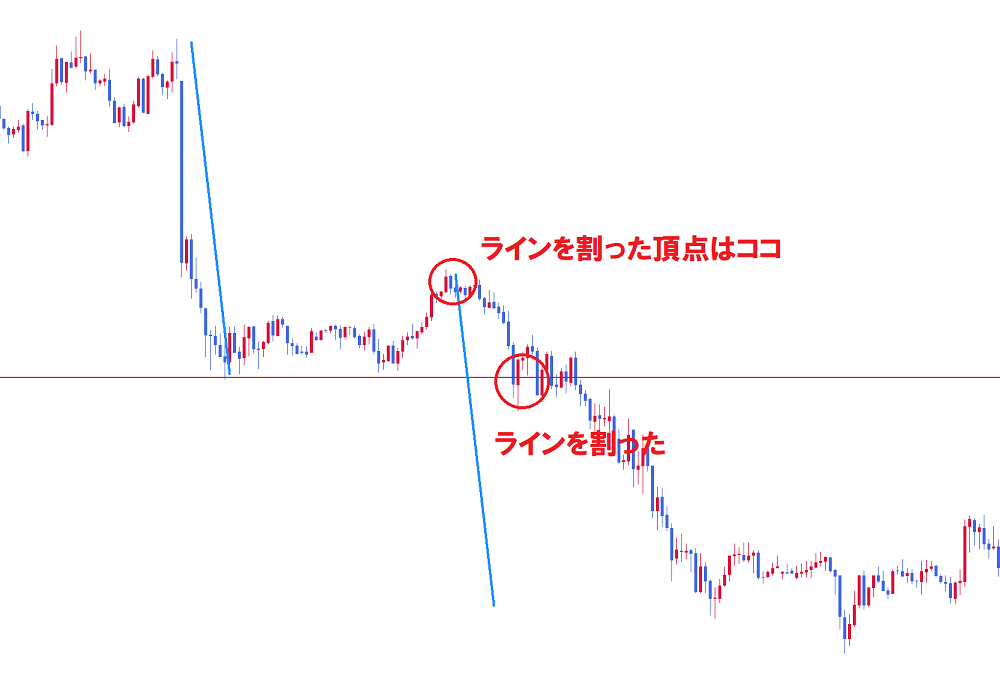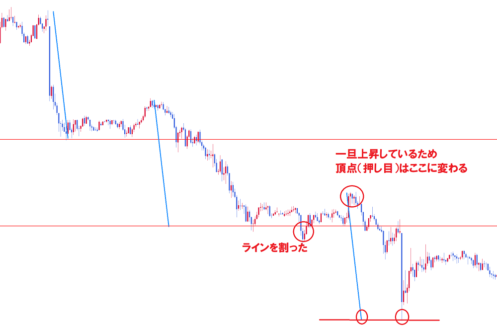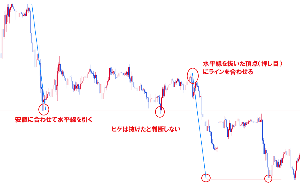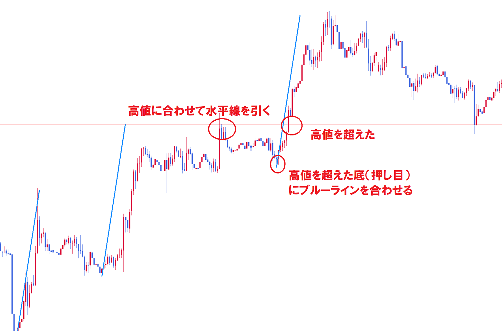次も同じように安値に水平線を引き、水平線を割った頂点(押し目)にブルーラインを引きましょう。