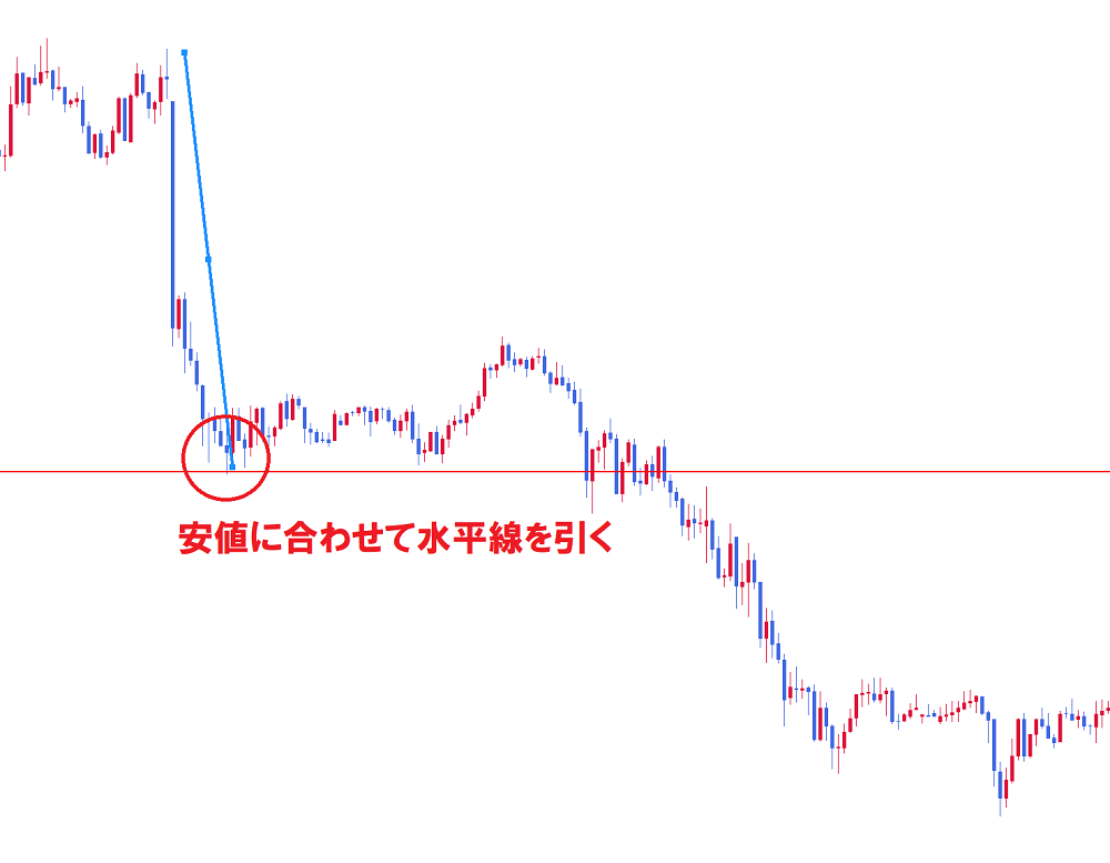 次に、今引いたブルーラインの安値に水平線を引きます。