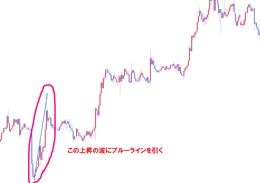 この水平線(高値)を超えた波の底(押し目)にブルーラインを合わせます。