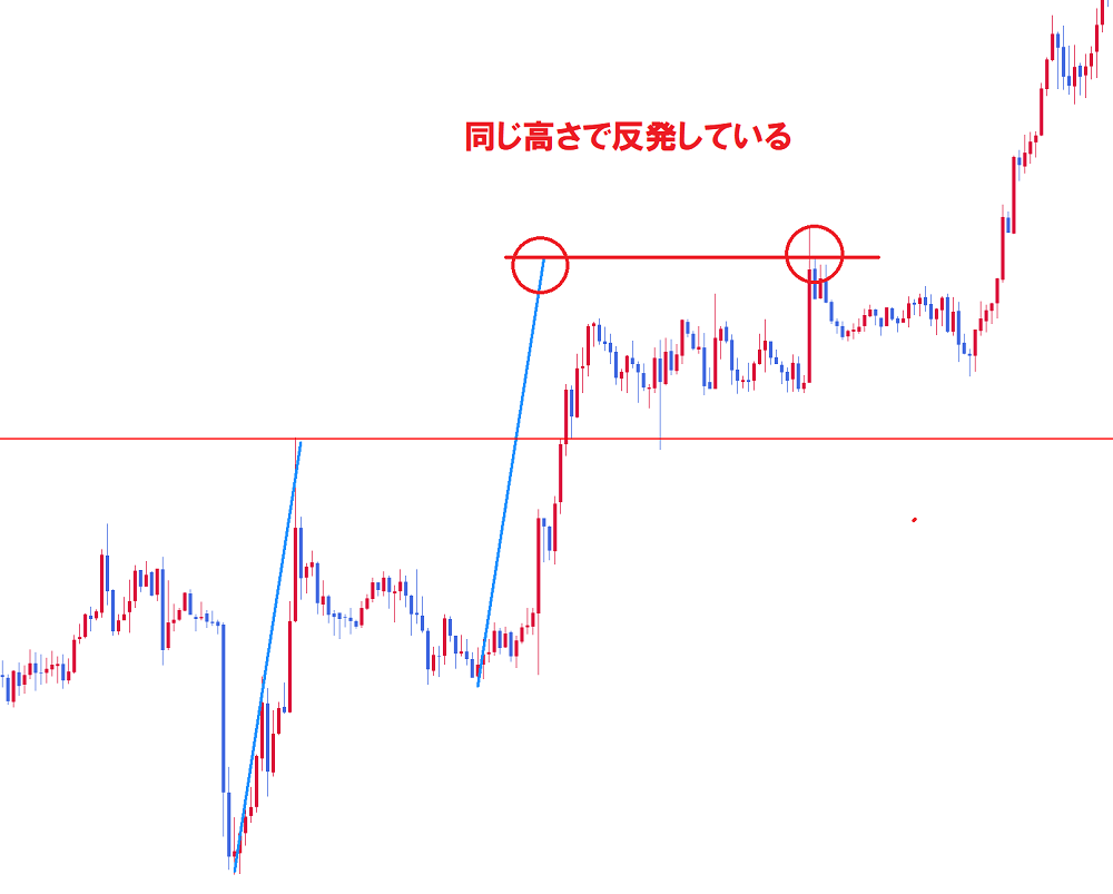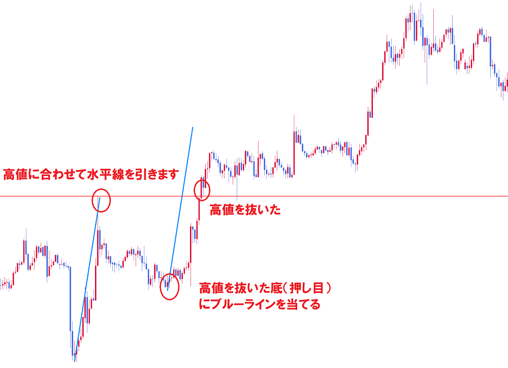 次に、水平線(安値)を引き、水平線を抜いた頂点(押し目)に合わせてブルーラインを当てます。