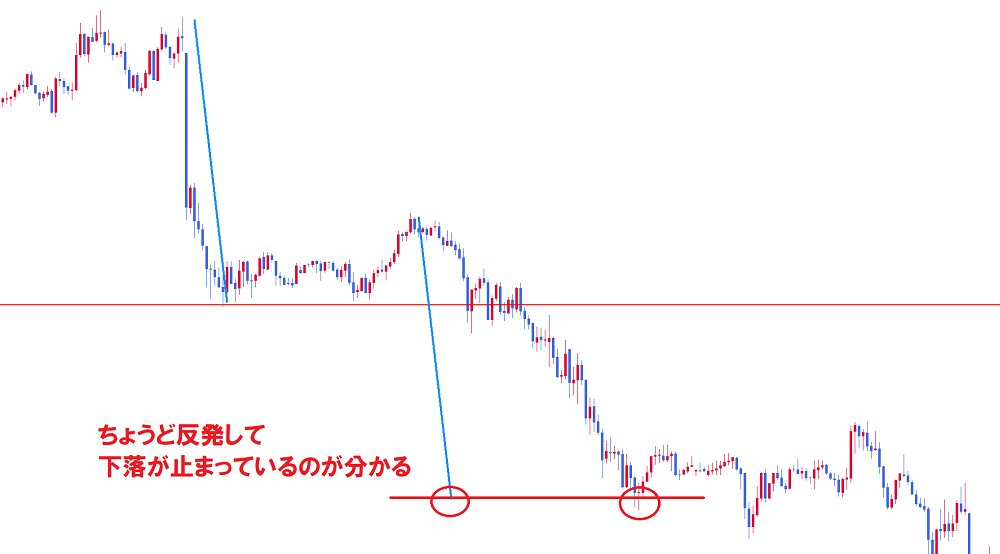 そうすると、先ほどと同じようにブルーラインの先端で下落が止まっているのが分かります。