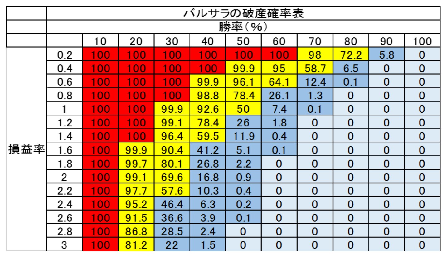 バルサラの破産確率表で、破産確率が1%を切るようであれば、資金が尽きることなくく、勝ち続けられるトレードができるのです。