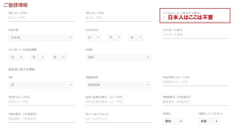 名前や生年月日、郵便番号、電話番号、メールアドレスなど必須項目を埋めていきます。