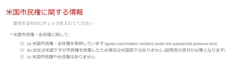 米国市民権と永住権を持っていない場合は、「米国市民権や永住権はありません」という欄にチェックを入れます。