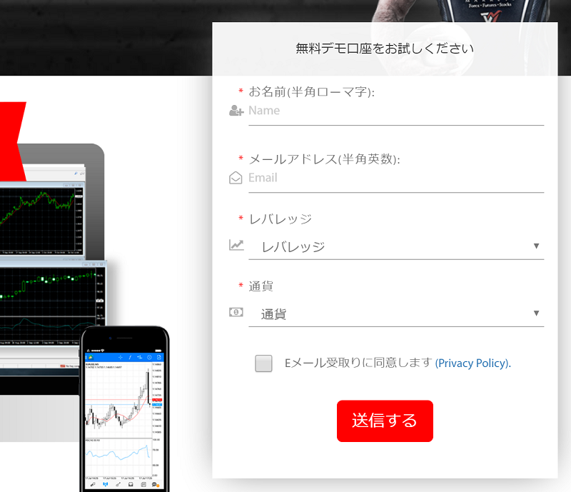 次に、名前、メールアドレス、レバレッジ、通貨タイプを選択し、「メール受け取りに同意します」にチェック。