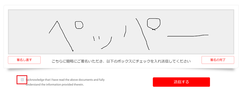 署名が完了したら、「署名の完了」から「送信」とクリックすれば、口座開設の手順は完了です。